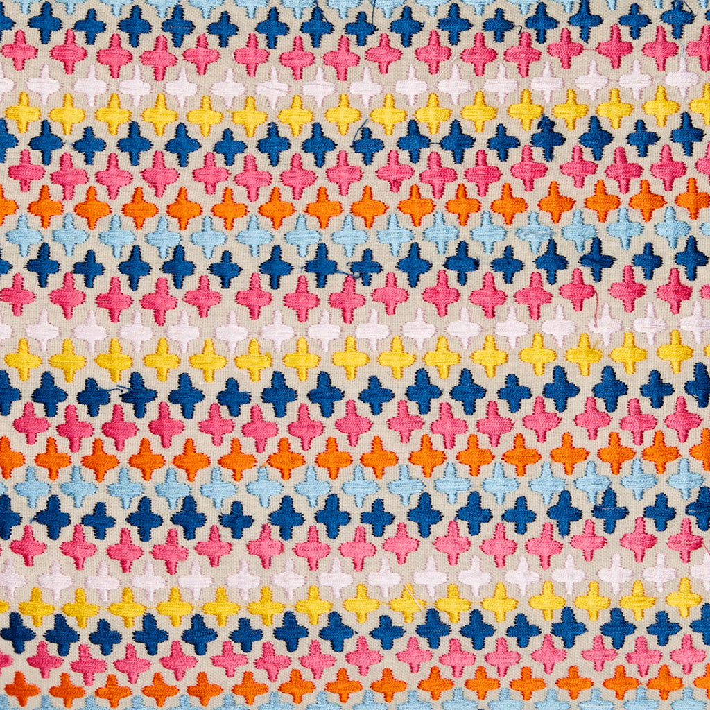 Alive with rows of colorful embroidery, each tiny cross a stitch of vibrant joy.