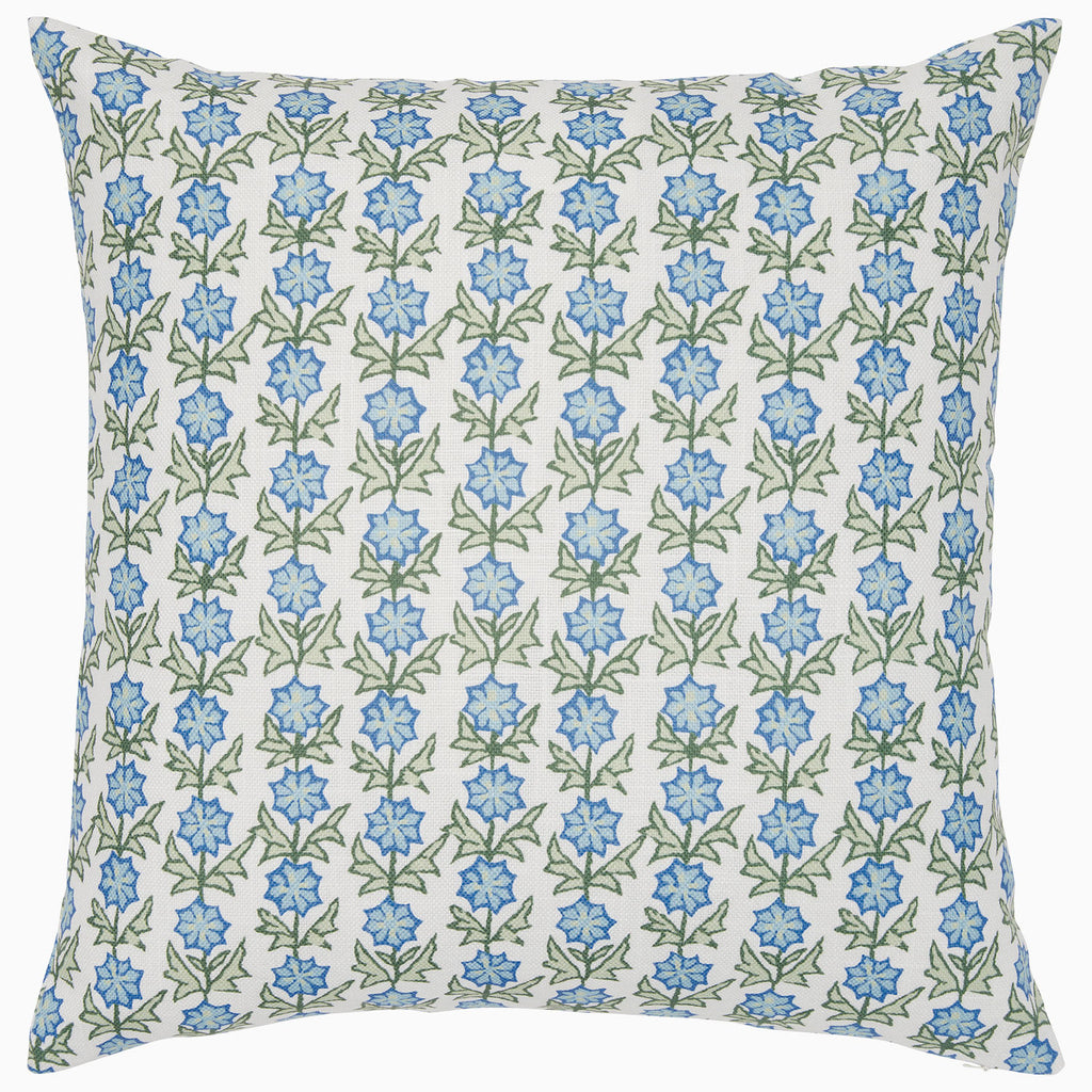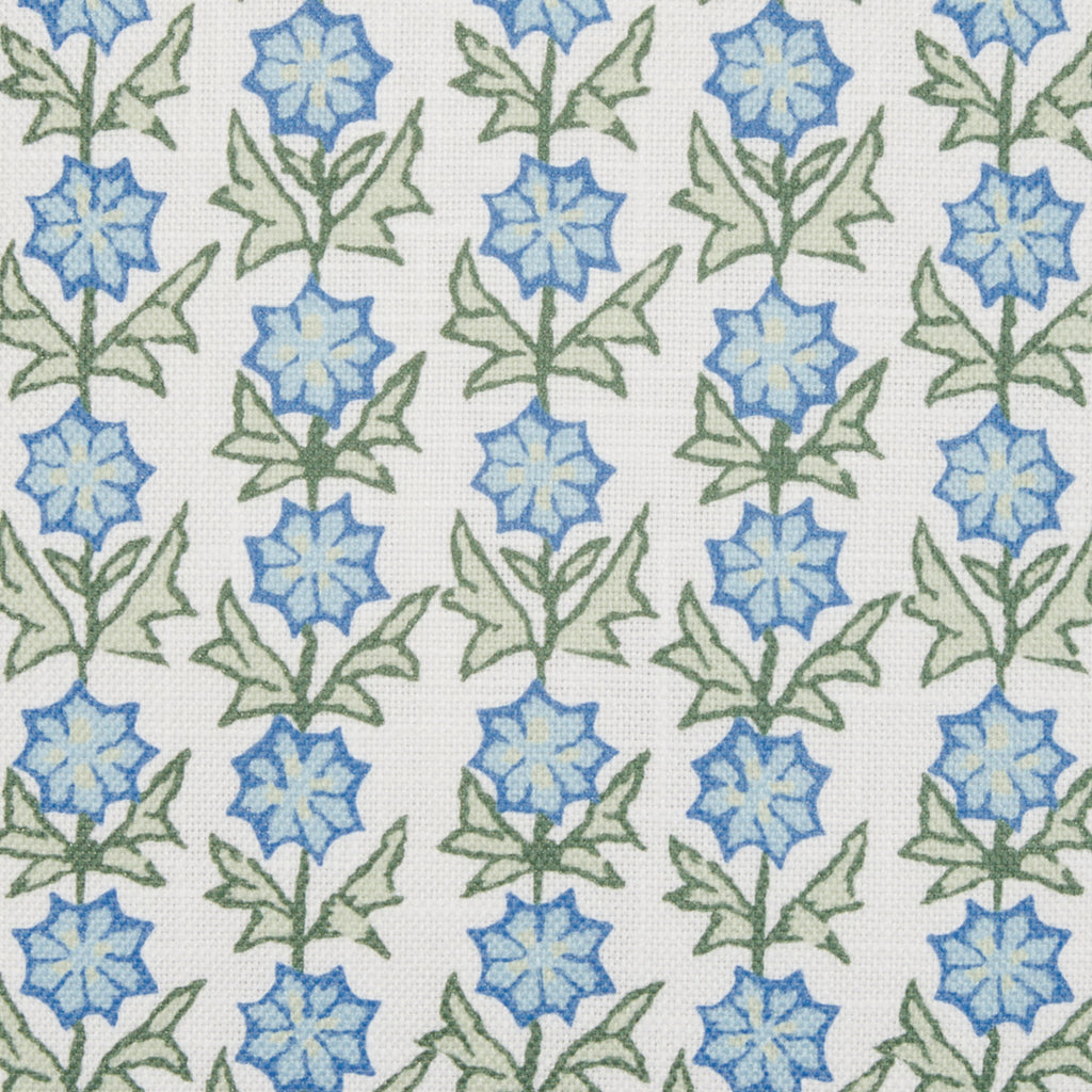 Dainty blue blossoms trail across cotton linen in a lively, graphic repeat. Resistant to sun and rain, so the outside of your home can be just as beautiful as the inside. Please note, some fading does occur over time due to extended outdoor use.
