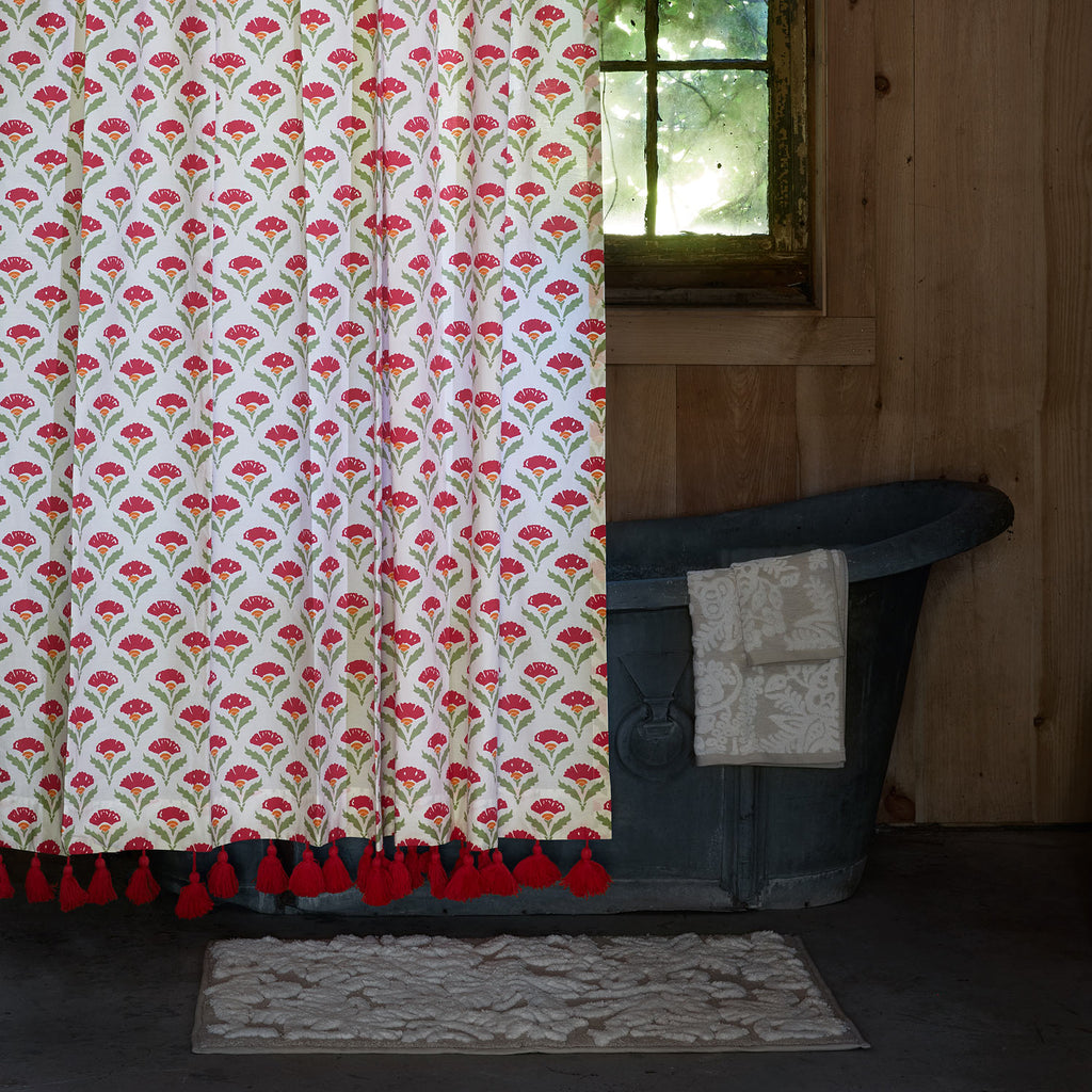 Rows of stylized blooms in vibrant pink with orange centers, framed by soft green leaves. The design has a hand drawn, block printed charm, with each motif fanning out like a miniature garden.