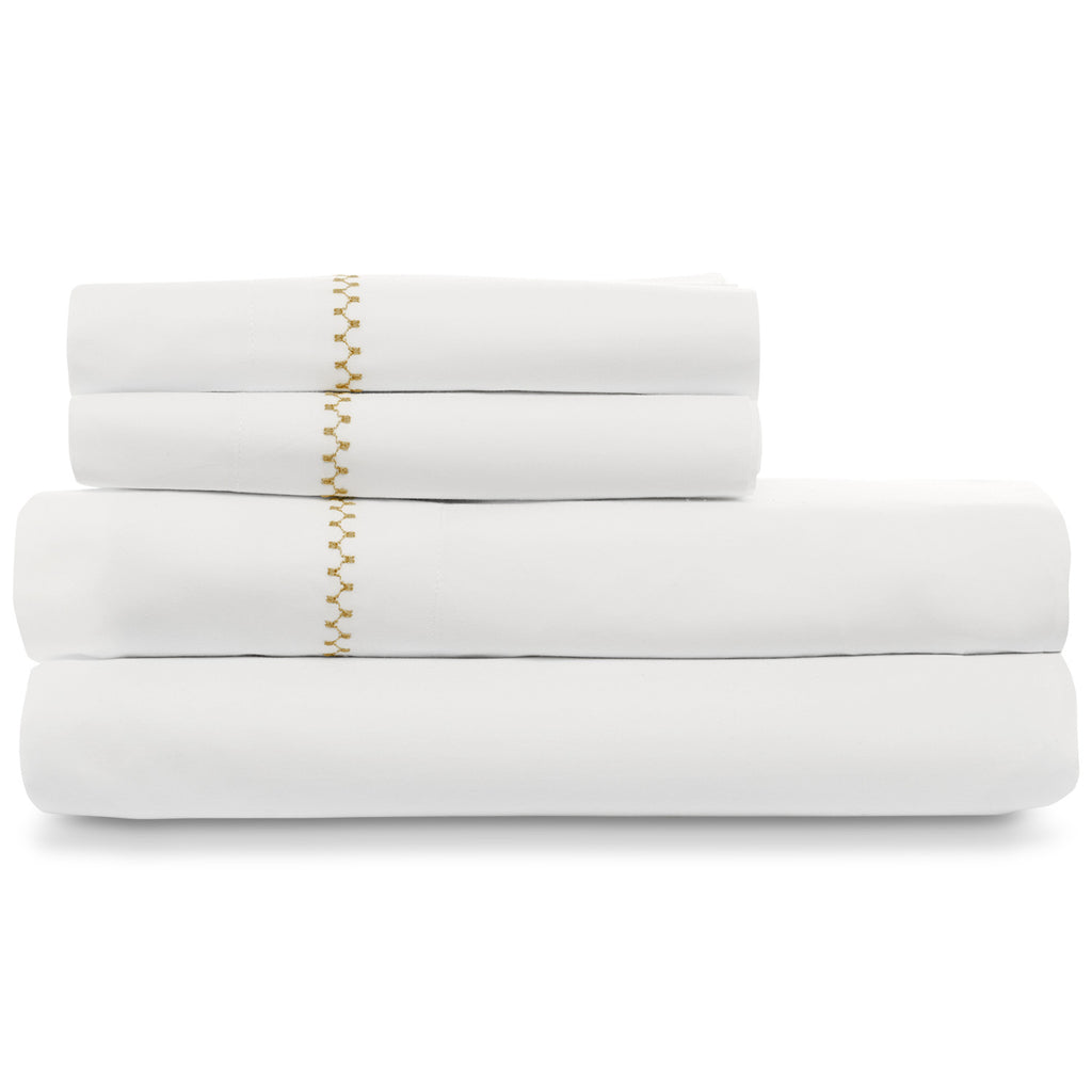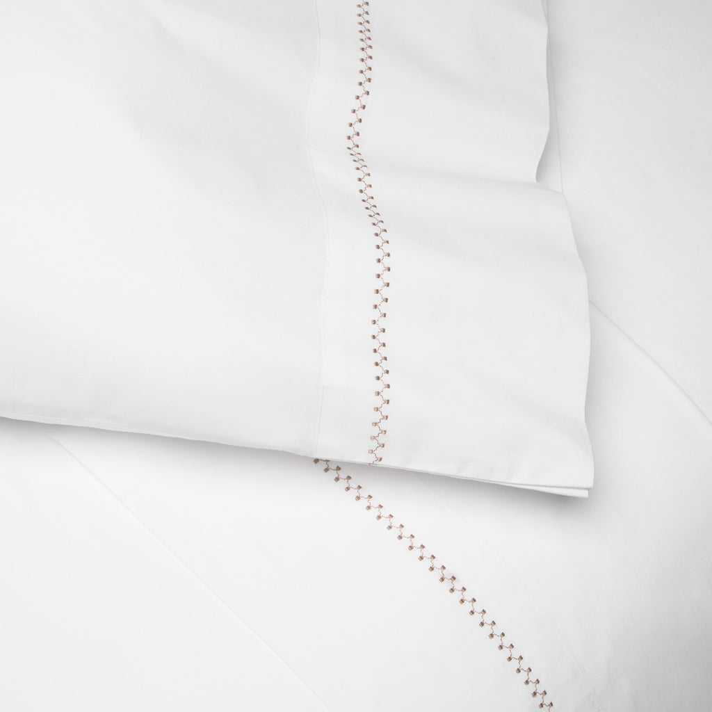 We enlarged one of our hand-embroidered designs to create the subtle ribbon of sand on this sheet set.