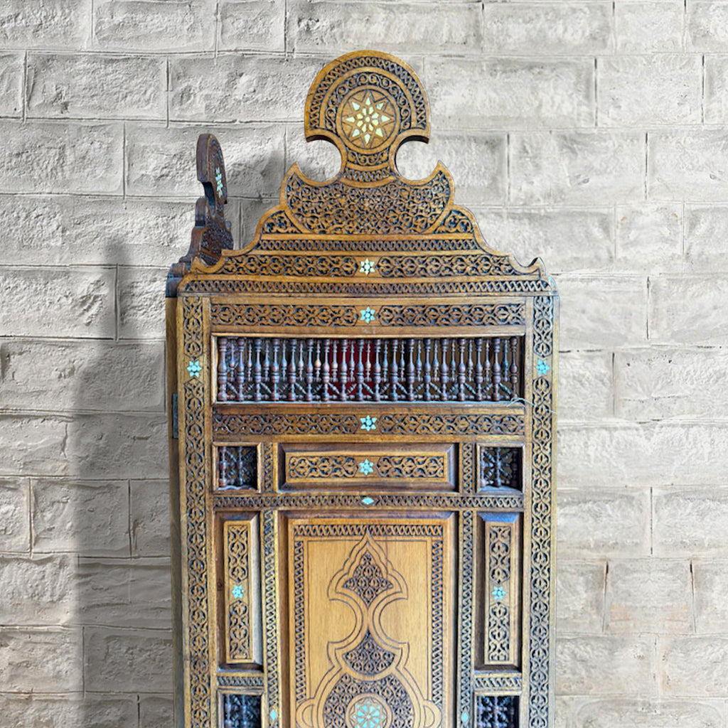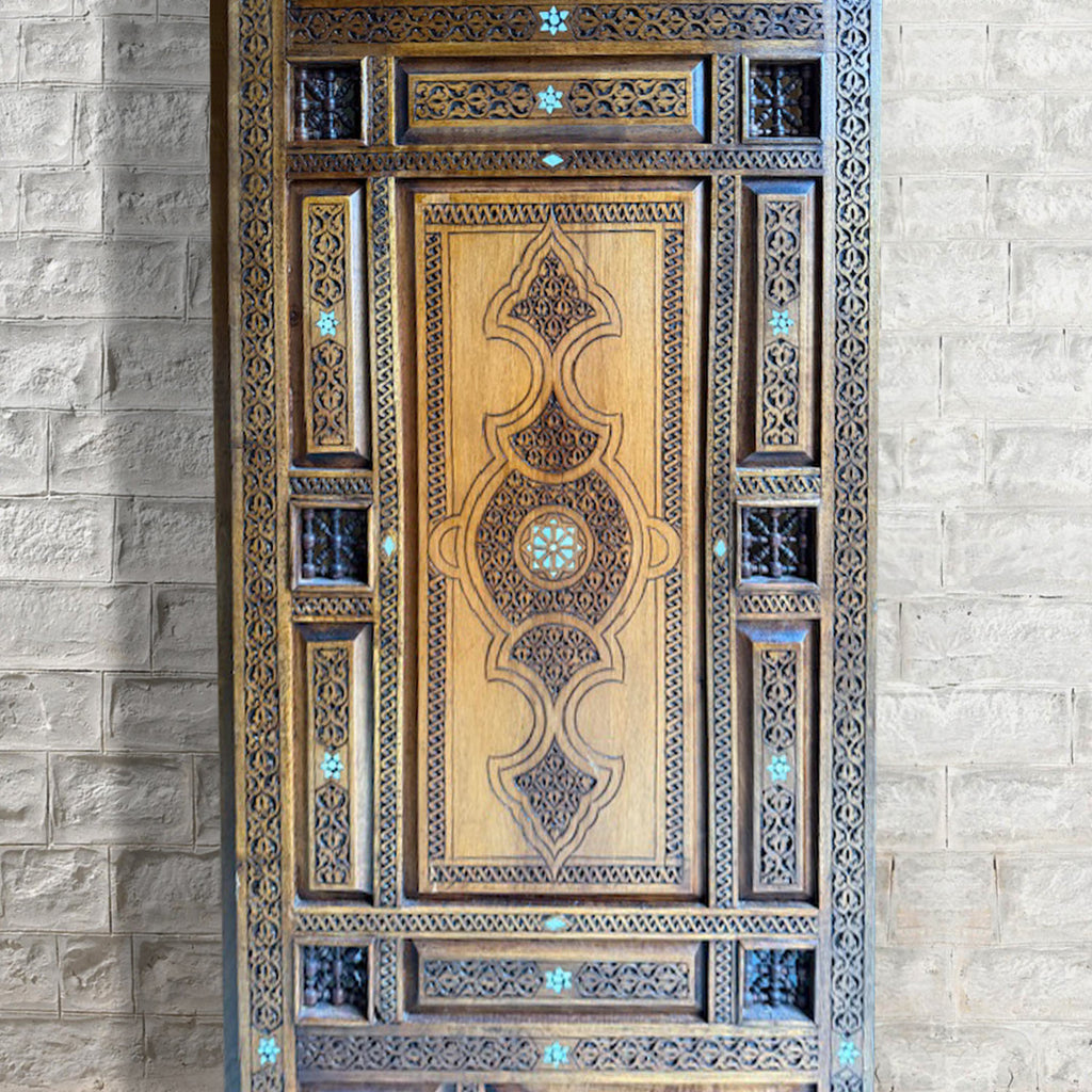 This bone inlay screen features detailed patterns and bold borders set against warm wood tones. A beautiful piece for adding a bit of privacy to a room.