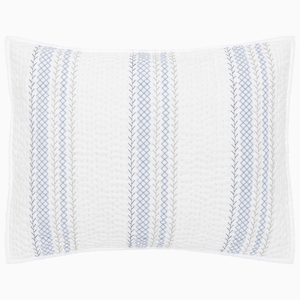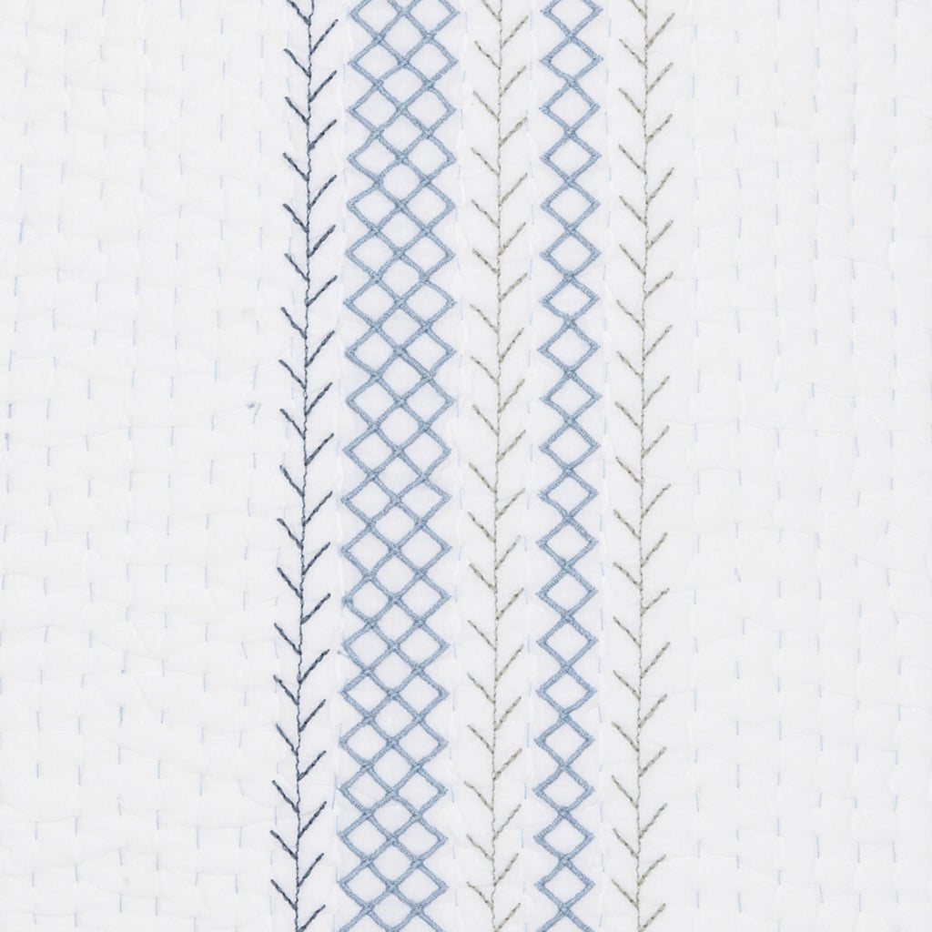 A celebration of the art of stitching, featuring alternating rows in shades of indigo and sage on hand quilted organic cotton voile.