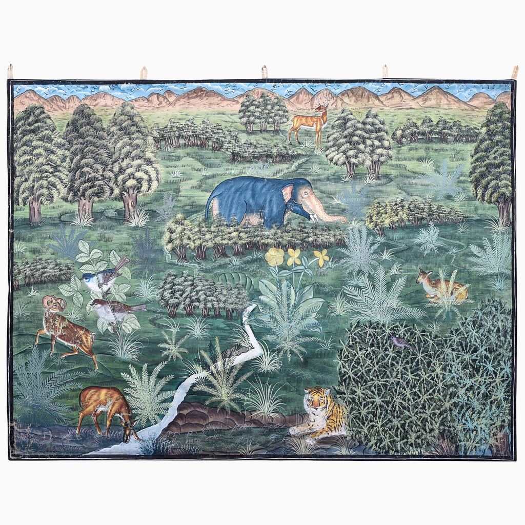 A peaceful moment in the forest, where elephants roam and tigers lounge beneath painted palms. This painting is in the Shikargah, or "hunting grounds" tradition, where lush royal preserves are depicted in miniature paintings and palace murals.