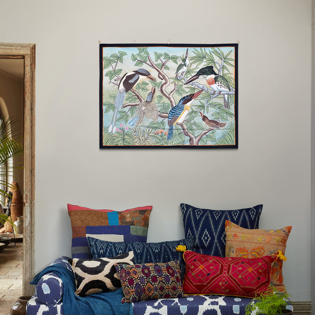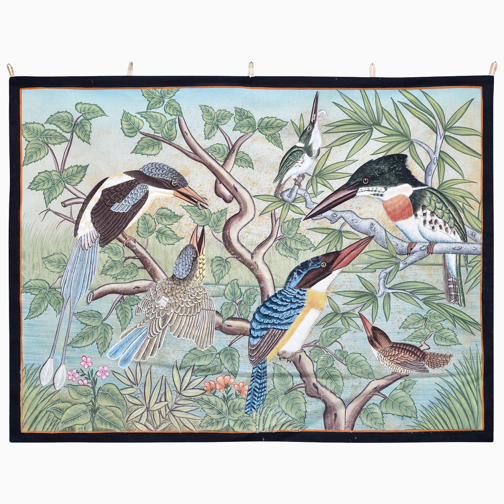 This vivid hand-painted tapestry showcases a gathering of kingfishers, beloved in Indian folklore as symbols of patience, agility, and grace. Known for their shimmering feathers and still-water dives, these birds often appear in miniature paintings and Mughal nature studies.